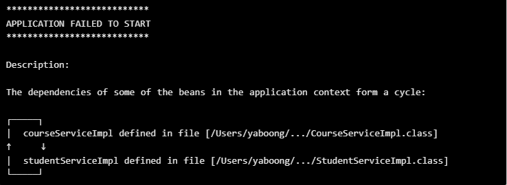 @Component public class Hello{ @Autowired World world; //World객체를 참조한다. public void method1() { world.method2(); } } -------------------------------- @Component public class World{ @Autowired Hello hello; //Hello객체를 참조한다. public void method2() { hello.method1(); } }위와 같이 서로를 참조하고 있기 때문에
