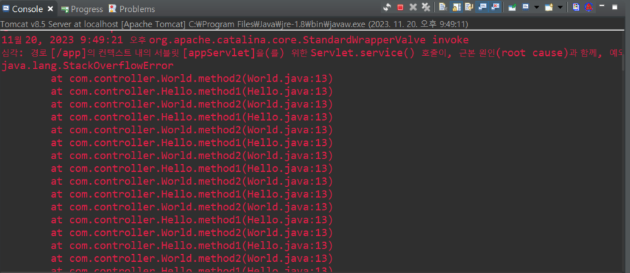 실행시키면 잘 구동이 되다가 method1 함수를 호출하는 순간에 순환참조로 인해 StackOverflowError가 터지게 된다.