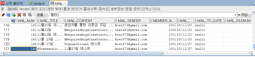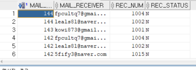 매핑테이블 mail_rec테이블 148번 메일이 저장됐지만 메핑테이블 저장과정에서 에러가 발생했기 때문에 148번 메일의 받는 사람이 저장되지 않은 모습을 볼 수 있다.