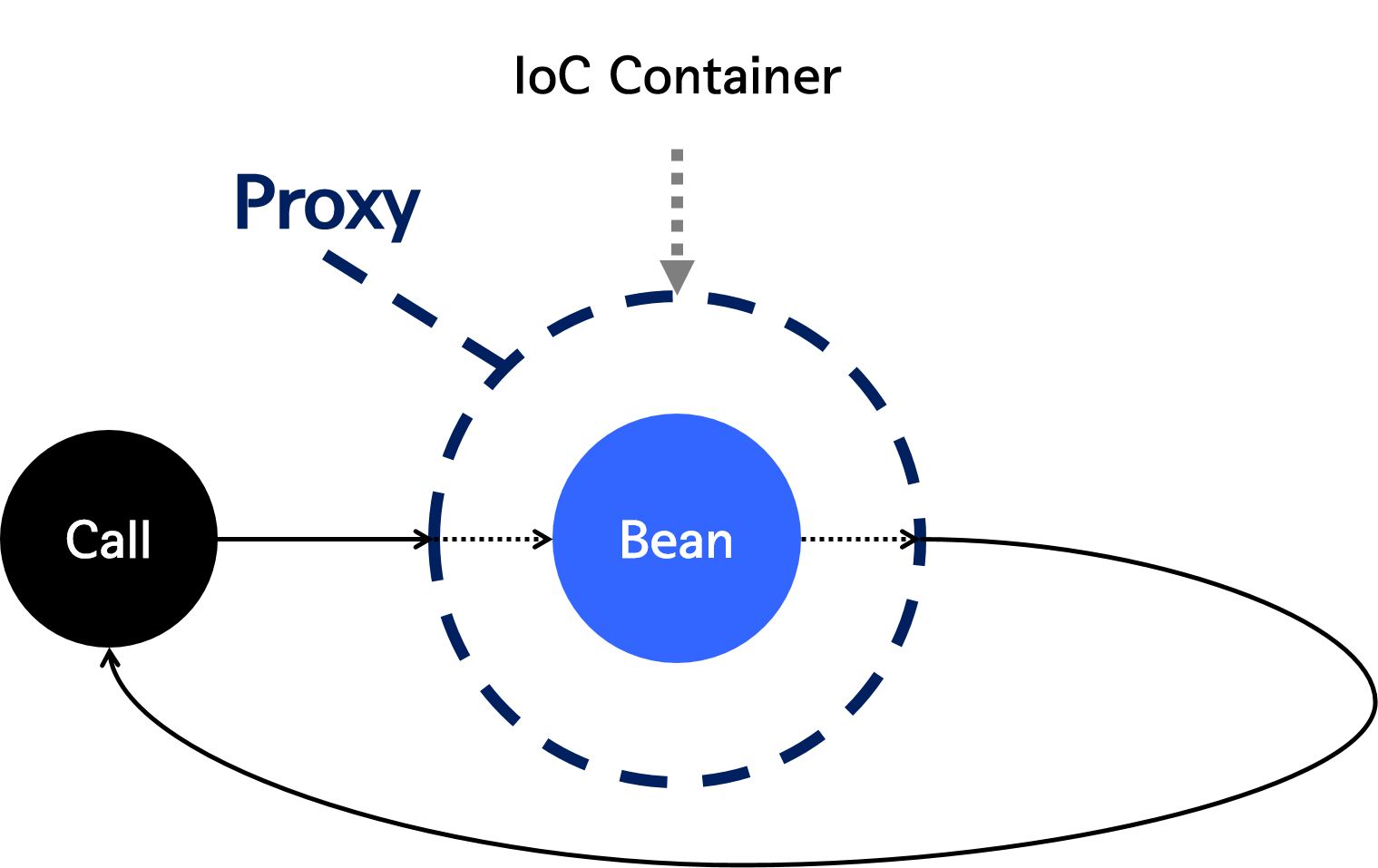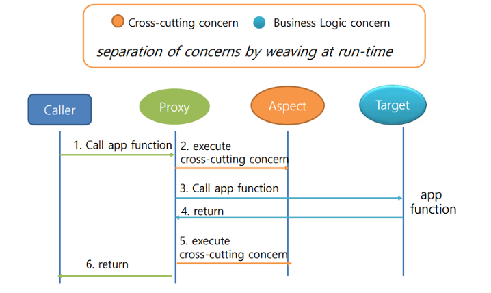 프록시는 타겟을 감싸서 요청을 대신 받아주는 Wrapping 오브젝트이다. 클라이언트가 타겟을 호출하게 되면, IoC컨테이너에 의해 프록시 빈을 생성하게 된다. 동적으로 생성된 프록시 빈은 타겟의 메서드가 호출되는 시점에 부가기능을 추가할 메서드를 자체적으로 판단하고 가로채어 부가기능을 주입해주는데, 이것을 런타임 위빙(RuntimeWeaving)이라 한다.