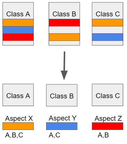 위의 사진과 같이 흩어진 관심사, 횡단 관심사의 모듈화를 통해 핵심 비즈니스 로직을 분리한다.