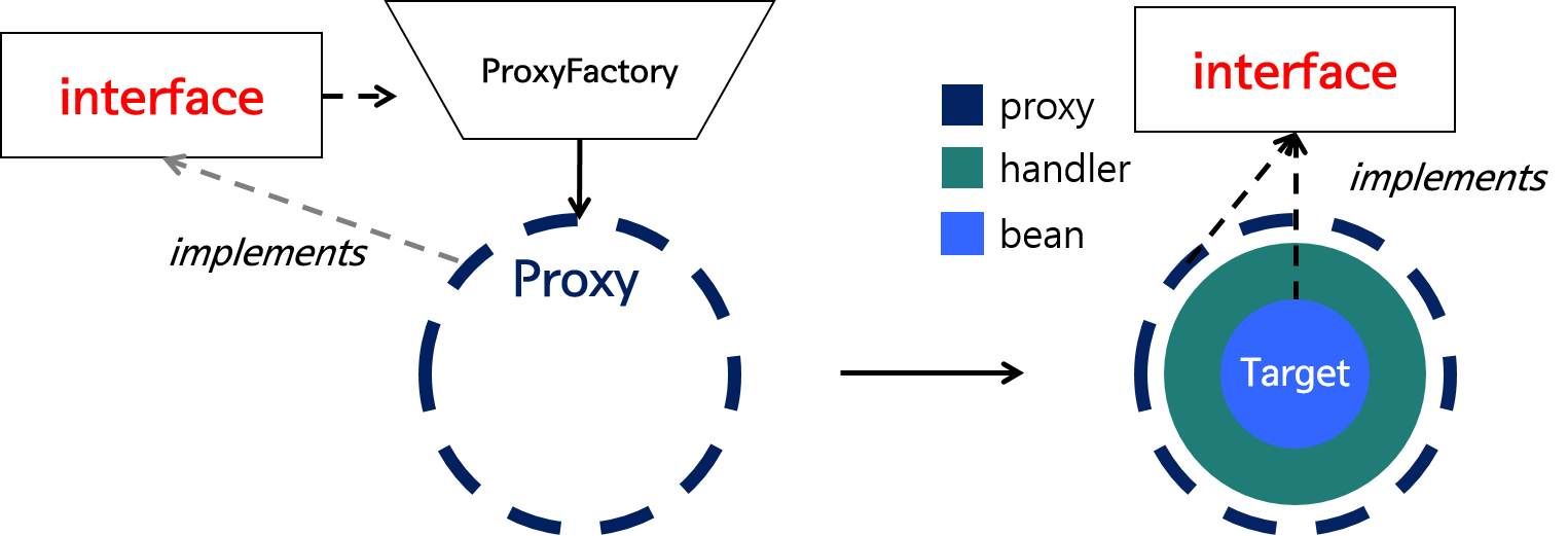 타깃의 인터페이스를 구현하여 Proxy를 생성한다. 타깃의 인터페이스를 자체적인 검증 로직을 통해 ProxyFactory에 의해 타깃의 인터페이스를 상속한 Proxy 객체 생성하고,