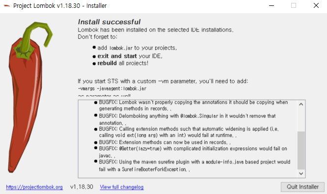 https://projectlombok.org/setup/eclipse 사이트에 의하면 lombok.jar파일을 더블클릭을 통해 직접 실행시켜서 설치해야한다고 한다.