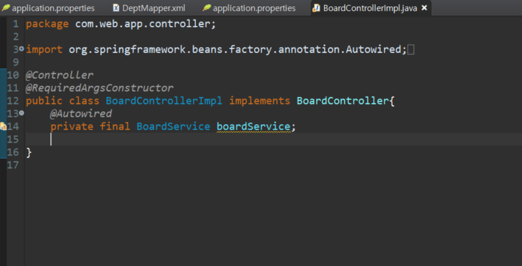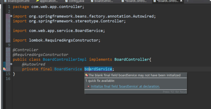 전에 팀프로젝트를 리팩토링 과정 중 생성자를 따로 쓰지 않으면서 생성자를 통한 주입으로 바꿔주기 위해@RequiredArgsConstructor를 썼었다. 그런데, 자꾸 "The blank final field boardService may not have been initialized"컴파일 에러로 final을 초기화 시키라고 뜨길래 "eclipse에서는 못쓰나..?" 하면서 어쩔 수 없이 생성자를 남겨줬었다.
