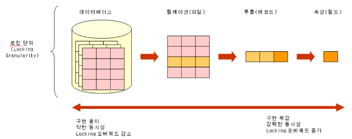 잠금 단위가 클수록 동시성 수준은 낮아지고, 동시성 제어 기법은 간단해진다.