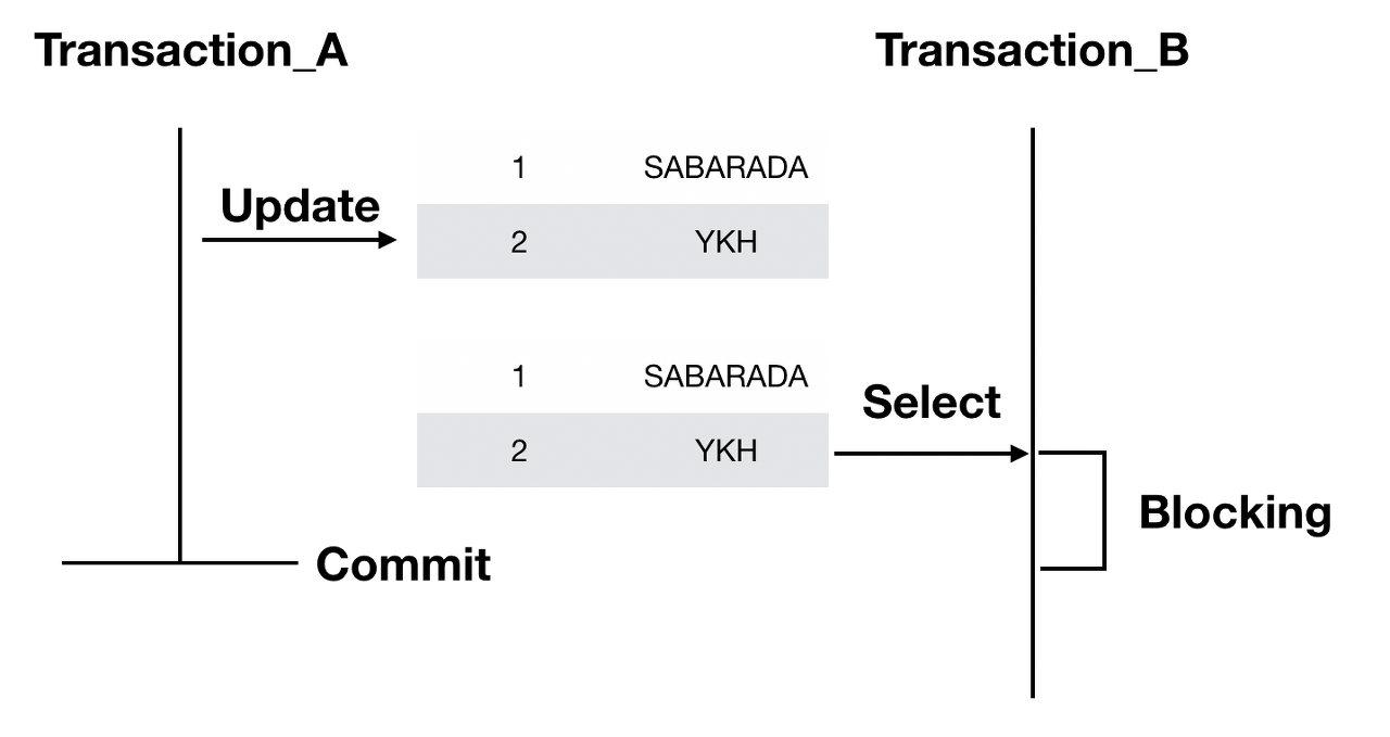 트랜잭션이 테이터에 잠금(Lock)을 설정하면 다른 트랜잭션은 해당 데이터에 대해 잠금이 해제될 때 까지 접근/수정/삭제가 불가능하도록 한다.