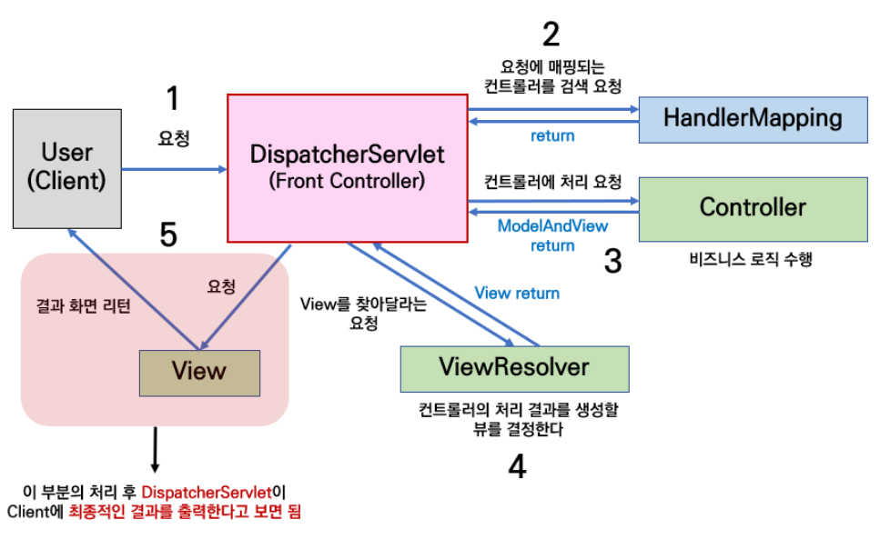 Spring MVC Pattern format 1. 유저가 DispatcherServlet(프론트 컨트롤러)에 요청을 보낸다.