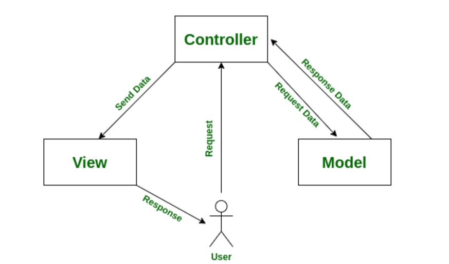 사용자의 요청을 Controller가 받고 Model에 연결해주며, Model에서는 필요한 데이터와 비즈니스 로직을 처리한 후 가공된 데이터를 Controller로 주며, Controller는 데이터와 함께 사용자에게 보여줄 View를 리턴해준다.