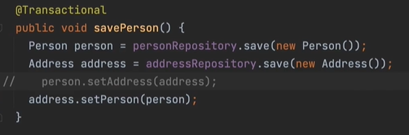 해당 코드를 보면, person테이블과 address테이블에 각각 객체를 저장해서 DB에 넣어주고 있다.그리고 person객체에서 setAddress를 통해 address_id 변수를 바꿔주게 되면 DB에도 똑같이 반영이 된다.