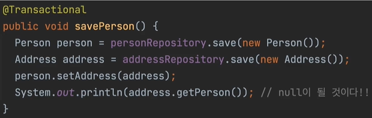 주인인 person객체가 setAddress하면 테이블끼리 연결이 되었기 때문에 주인이 아닌 Address객체의 Person도 변경 되었다고 생각할 수 있다. 하지만 트랜잭션이 끝나지 않았을 때, 한쪽만 연결해 둔다면 반대쪽은 null값이 나온다.