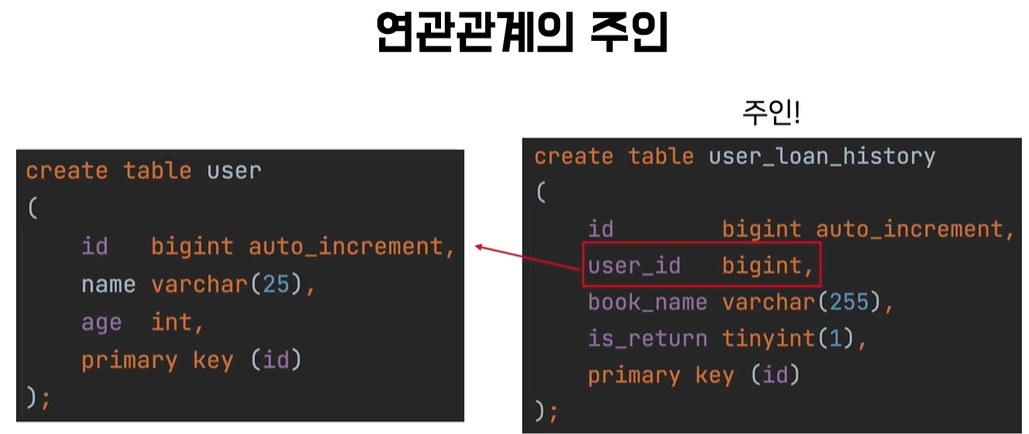 출처 : 인프런 - 자바 스프링부트 서버개발 올인원 UserLoanHistory테이블이 User테이블의 id인 User_id를 가지고 있기 때문에 주인이 된다고 할 수 있다.