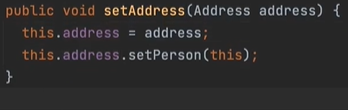 이를 해결하기 위해서 setter로 Person의 Address와 Address의 Person을 한번에 이어줄 수있다.