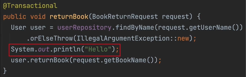 user를 가져오는 부분이 실행이 되고, Hello를 출력하고, 도메인 로직(userLoanHistory를 찾는 로직)을 실행하는 것이다.