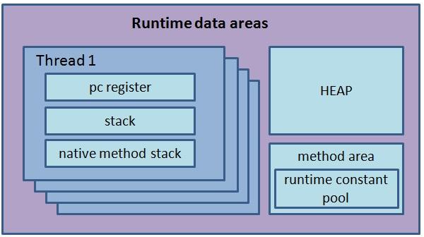 JVM은 OS에서 할당받은 메모리 영역(Runtime data aeras)을 메서드, 힙, 스레드 세가지 영역으로 구분한다.